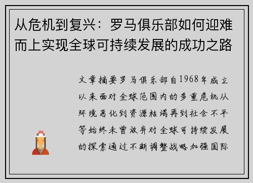 文章摘要:罗马俱乐部自1968年成立以来,面对全球范围内的多重危机,从环境恶化到资源枯竭,再到社会不平等,始终未曾放弃对全球可持续发展的探索。通过不断调整战略、加强国际合作以及倡导系统性思维,罗马俱乐部逐渐从危机中崛起,带领全球迈向更加可持续的未来。本篇文章将从四个方面详细阐述罗马俱乐部如何迎难而上,最终实现全球可持续发展的成功之路。这四个方面包括:首先,罗马俱乐部如何通过准确识别危机根源并提出创新性解决方案;其次,如何在全球范围内推动跨国合作和多方参与;第三,如何通过知识创新与系统思维引导全球行动;最后,罗马俱乐部如何建立长期的监测和反馈机制,确保可持续发展的成果能够得以持续并不断优化。